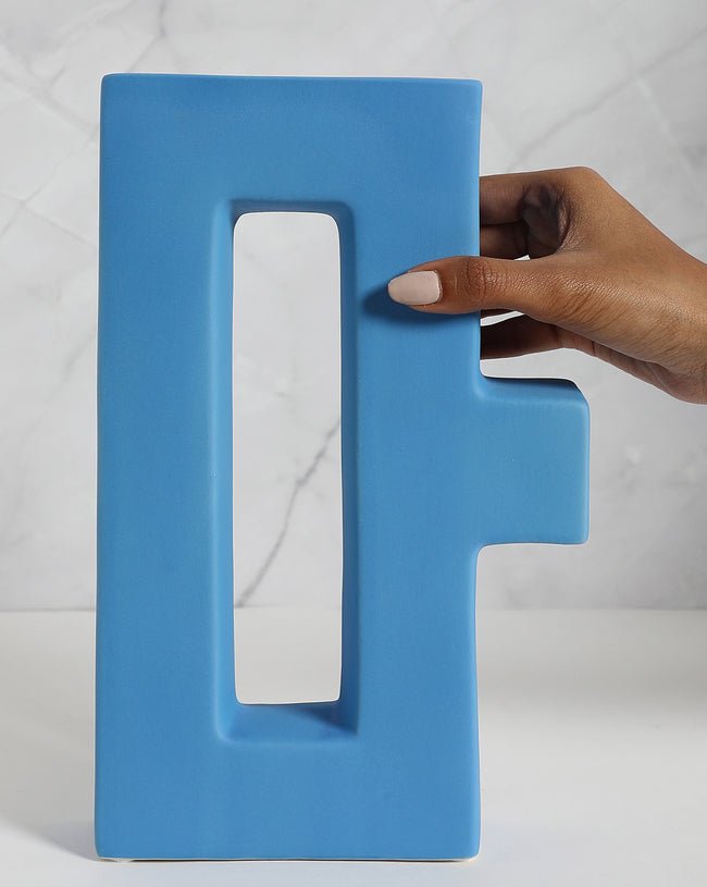 Add a bold pop of color and modern simplicity to your décor with this Blue Solid Minimalistic Ceramic Vase, featuring a sculptural geometric form and crisp openwork detail. The vivid blue matte finish and clean lines create an eye-catching display on shelves, mantels, or tabletops.