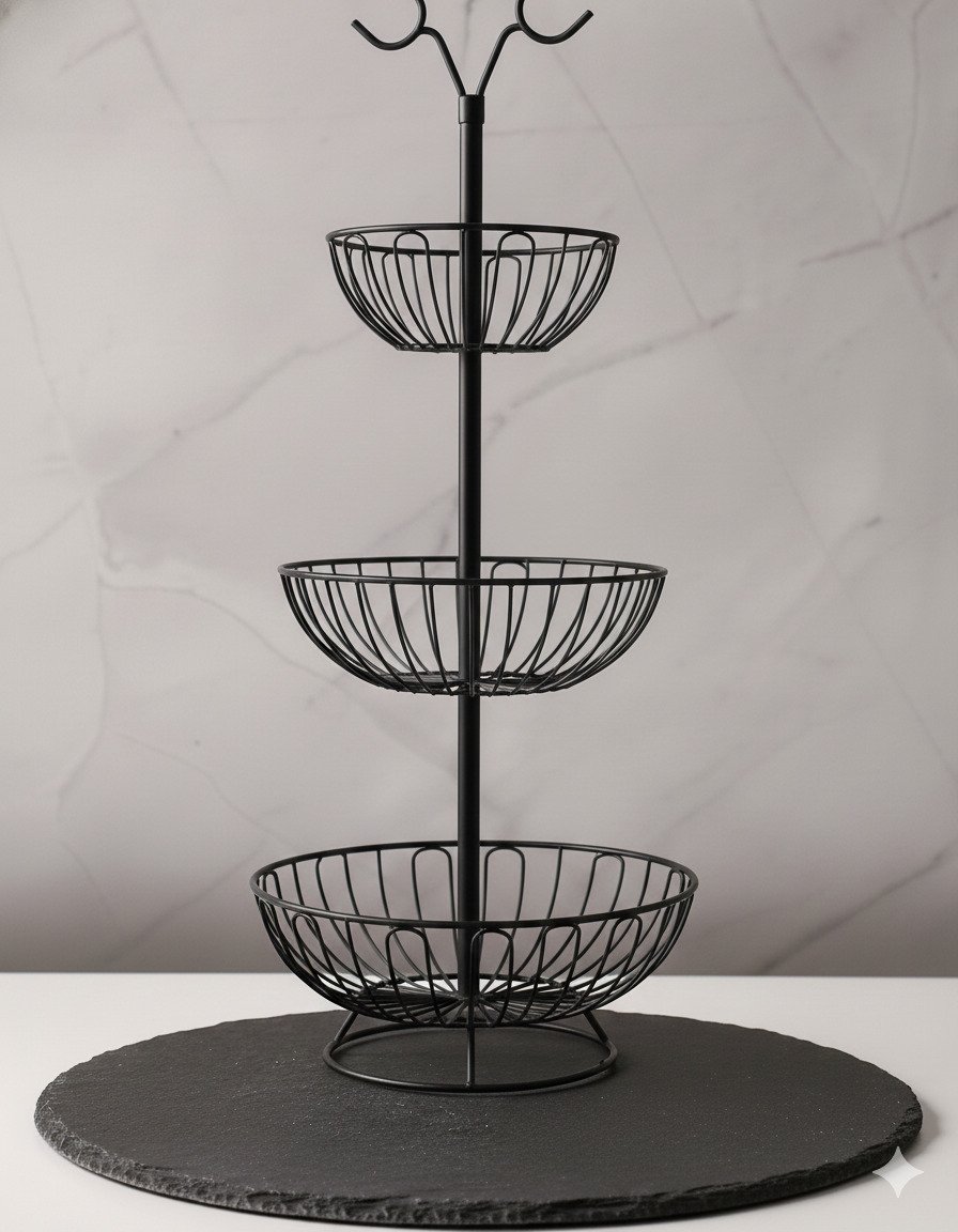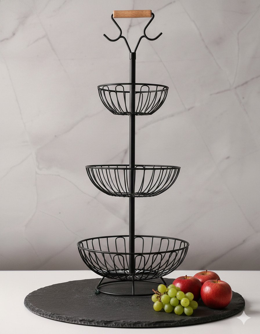 This highly versatile 3-tiered stand combines efficient vertical storage with thoughtful features, making it ideal for kitchen countertops or dining service. Crafted from dark Iron wire, the three generous baskets are connected by a central pole, topped with a comfortable natural wood handle and small hooks for extra hanging convenience.
