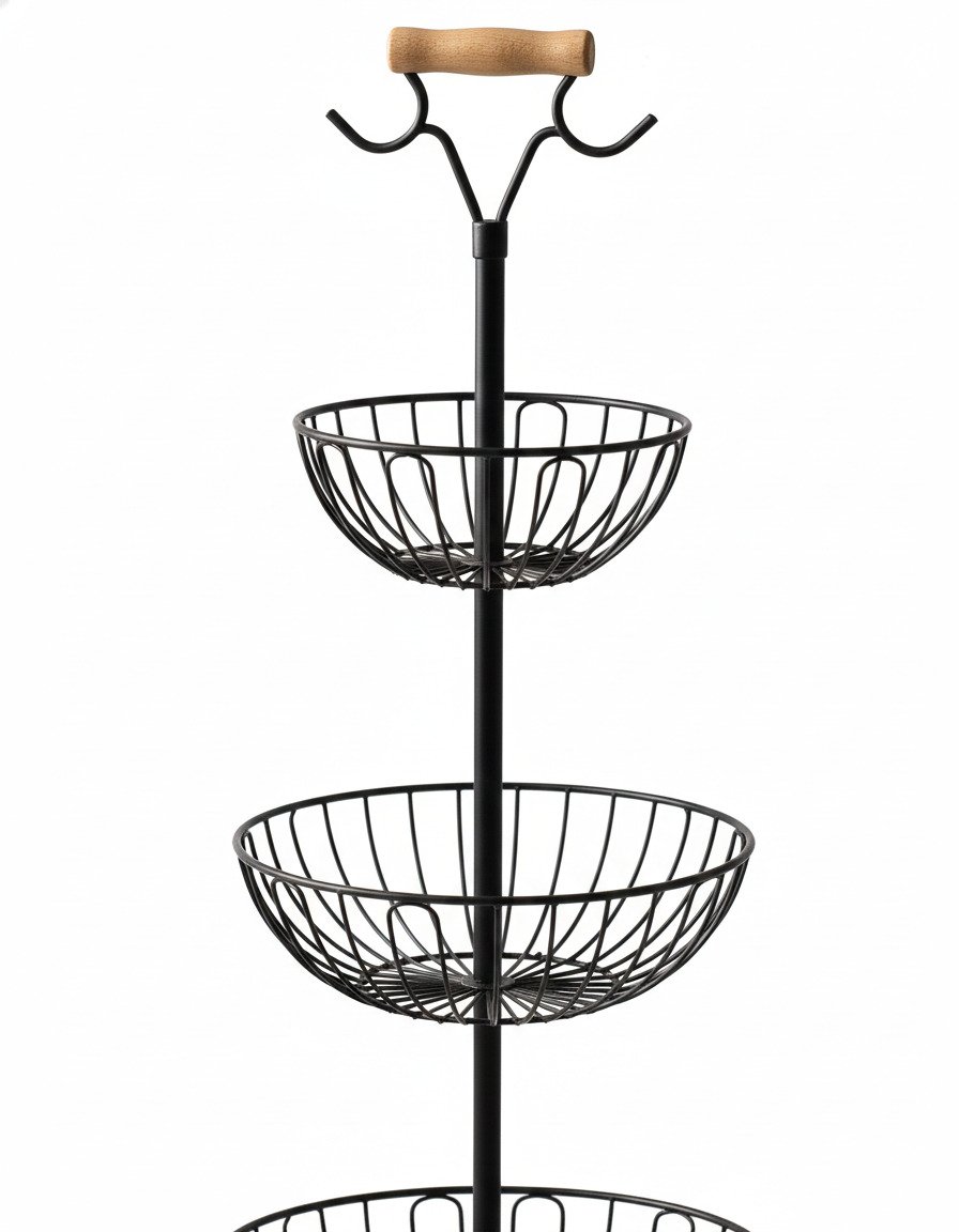 • Design: Freestanding vertical design with three round, tiered baskets supported by a central metal pole. Features a sturdy top handle with a natural wood grip and two small integrated hooks for hanging items like keys or kitchen tools.