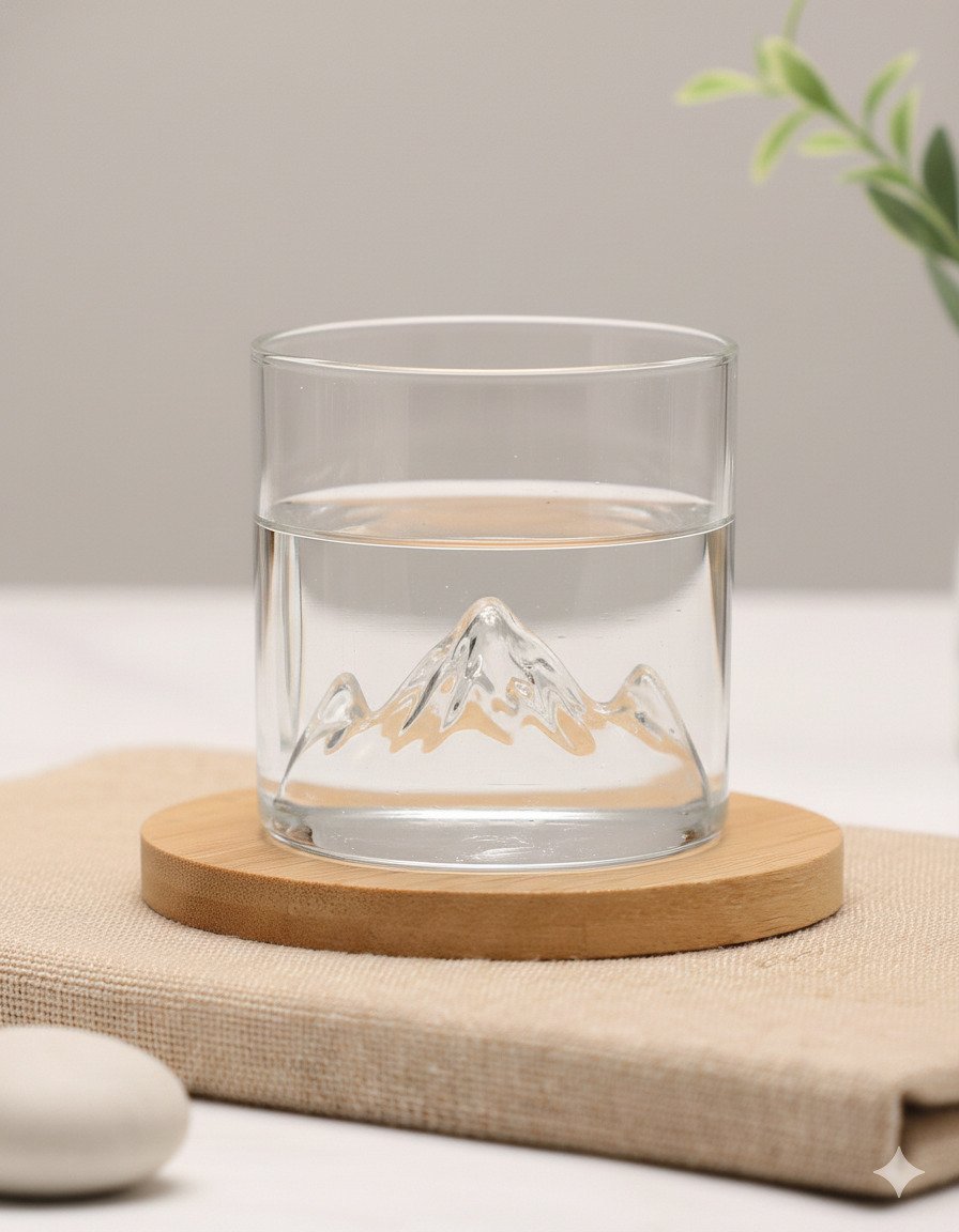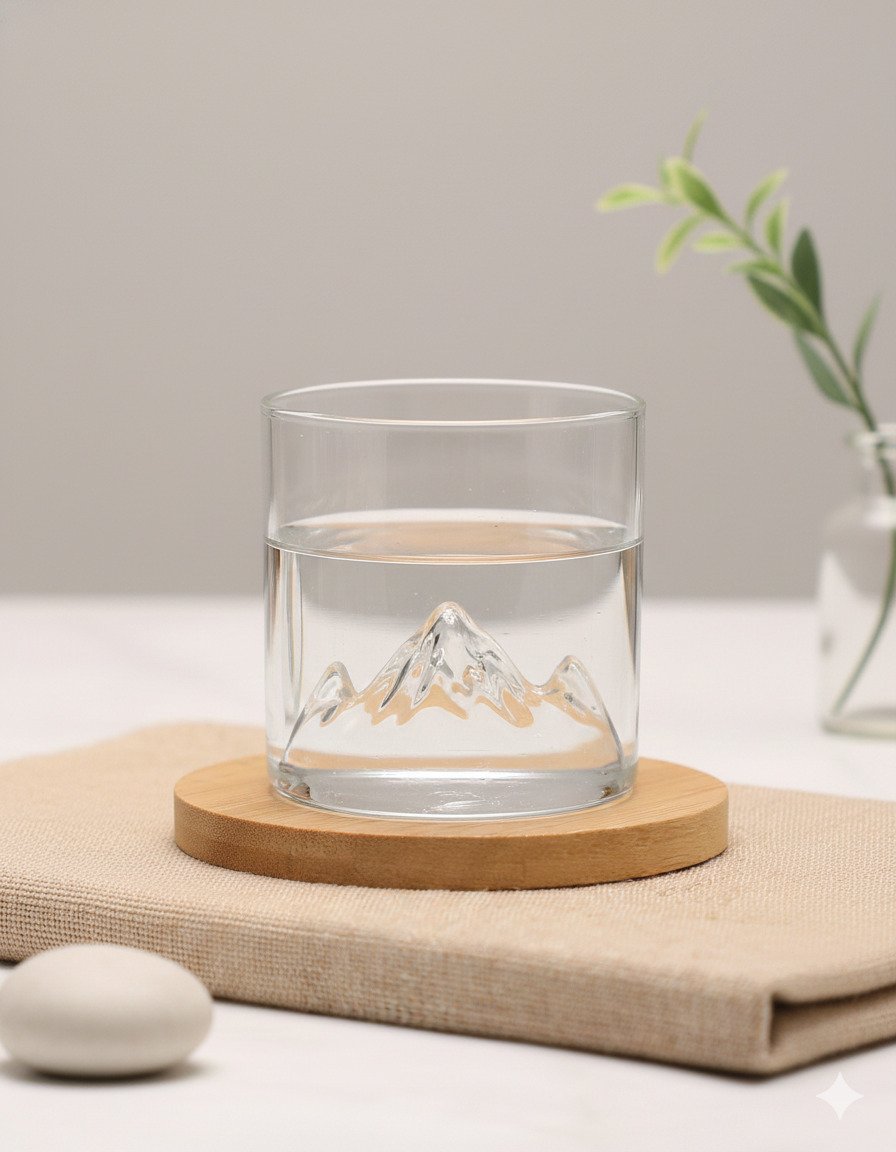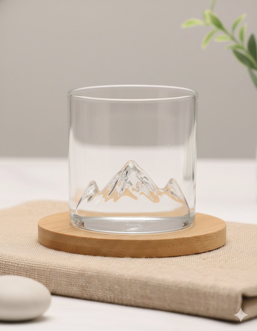 Material: Crafted from high-clarity, durable, thick-walled glass, sometimes featuring subtle metallic or gold accents on the mountain peaks.