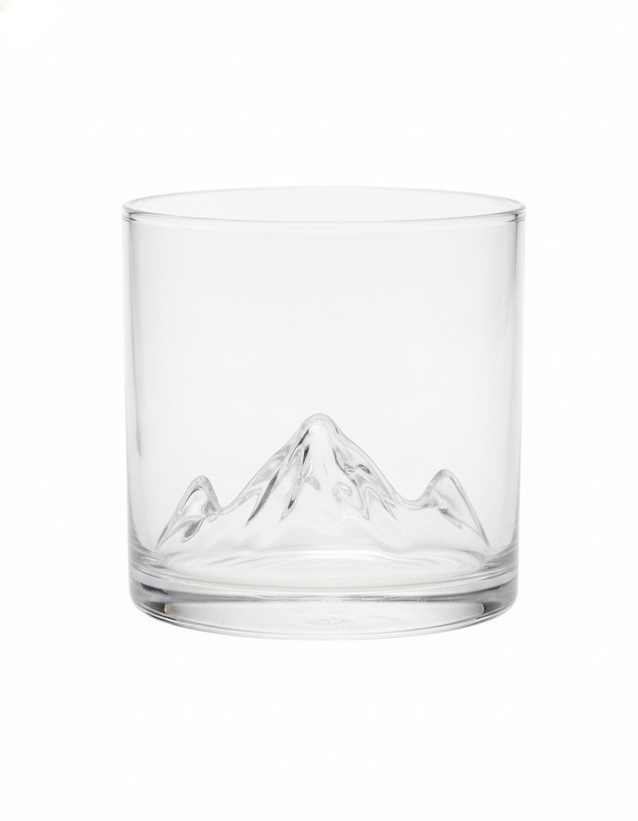 Design: Classic straight-sided tumbler silhouette with a thick, weighted base for stability. Features a unique, raised 3D mountain range sculpture molded into the bottom. This design naturally elevates the spirit and enhances the visual drama.
