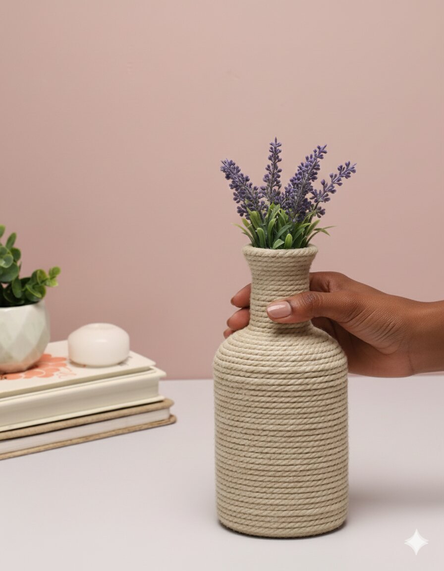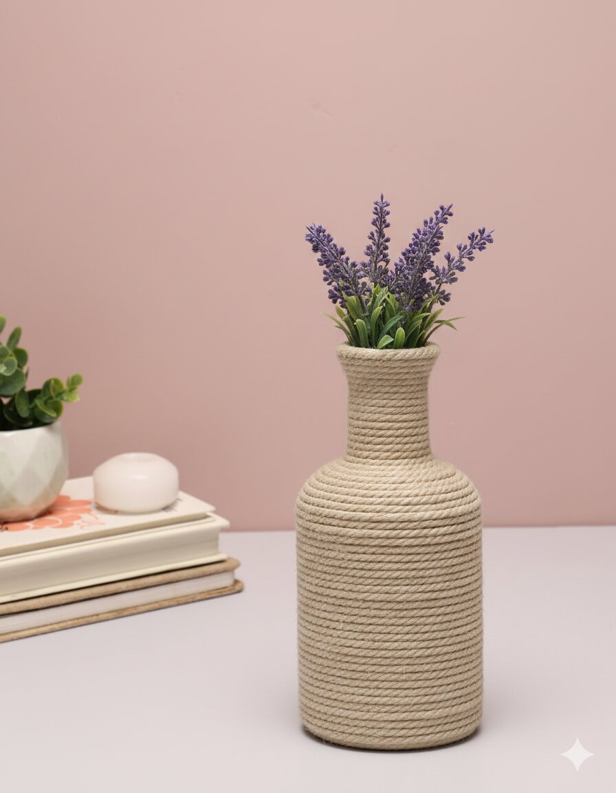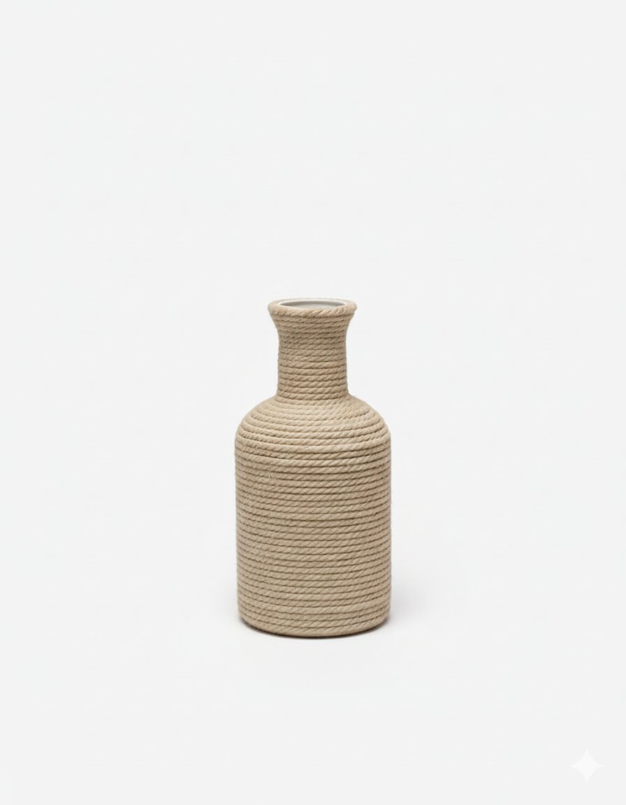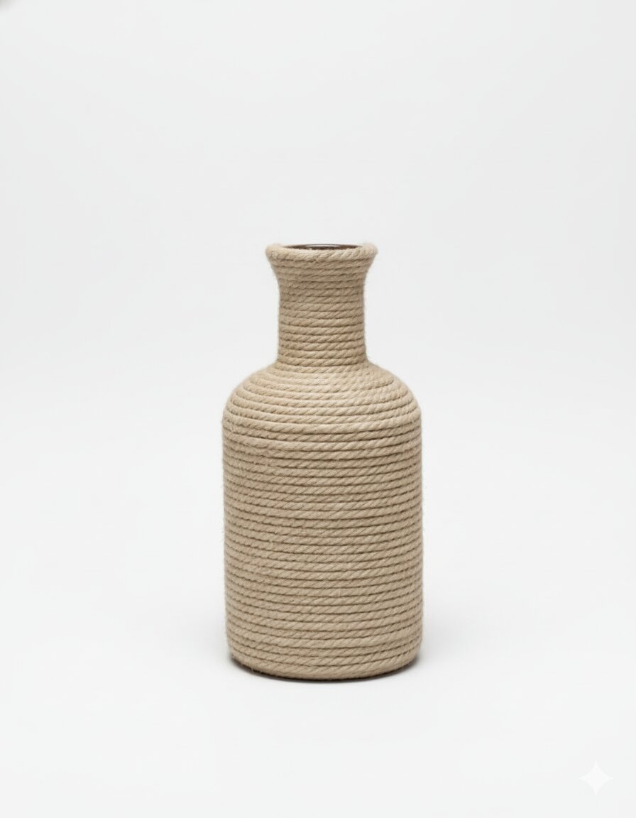 Design: Cylindrical base and tapered neck covered in tightly woven beige rope for a warm, handcrafted aesthetic