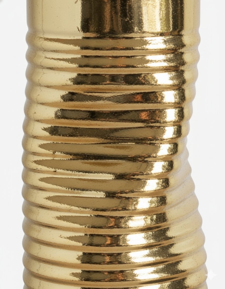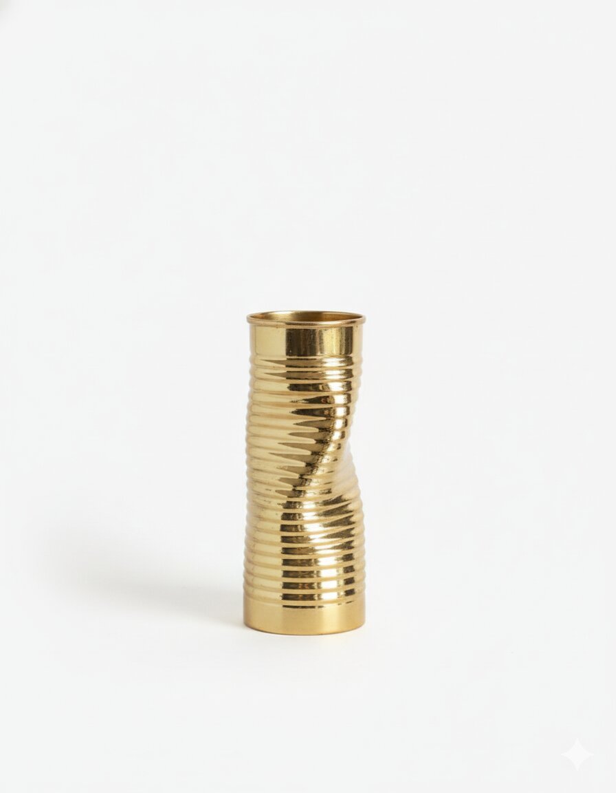 • Design: Sleek, gently curved cylinder form finished in reflective gold with expressive, pinched-in horizontal banding for artisan texture