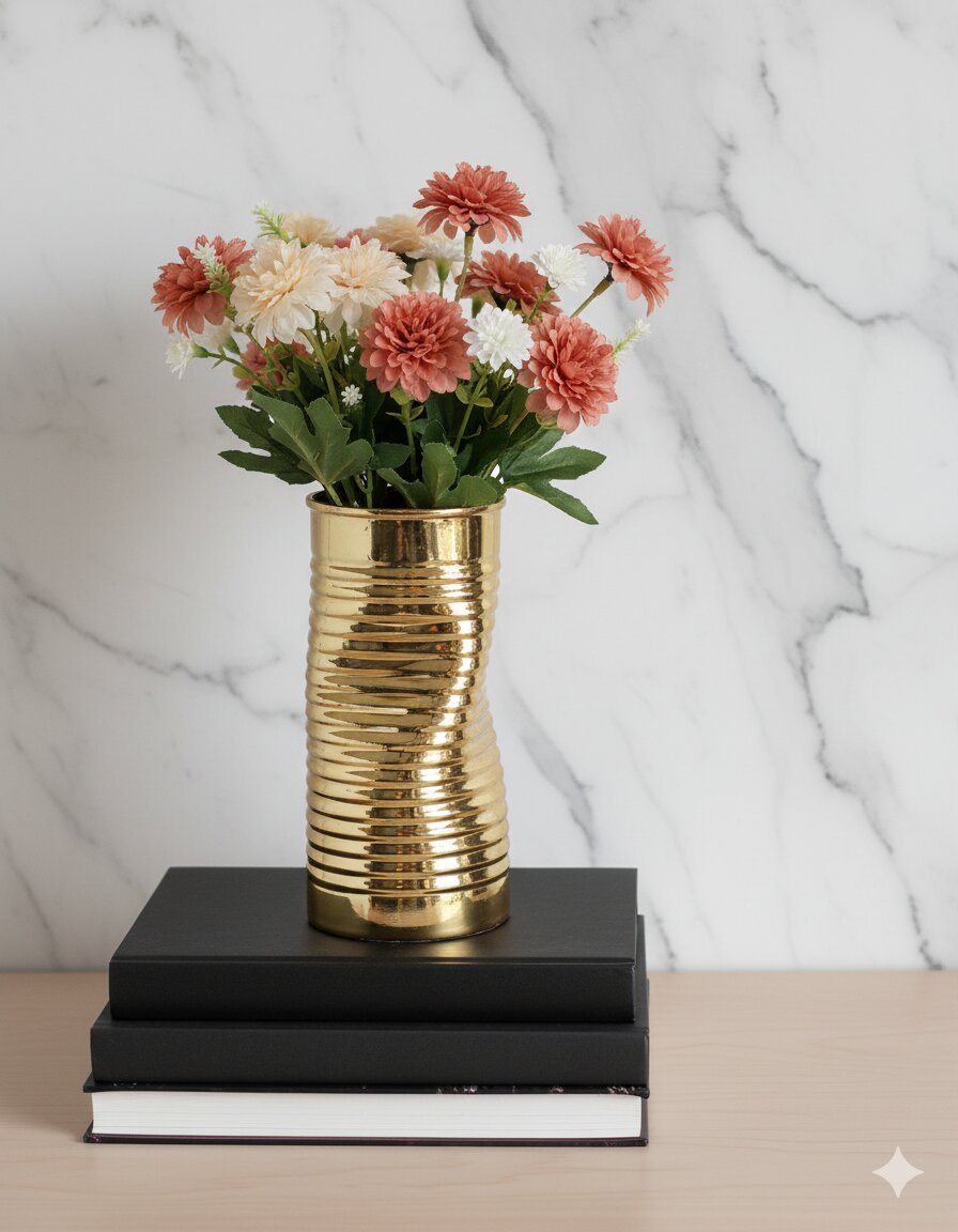 Infuse a touch of luxury into your decor with this Medium-Sized Golden Vase with Hand-Pinched Horizontal Stripes. The modern silhouette is wrapped in eye-catching, gleaming gold glaze and adorned with a series of unique, hand-pinched ridges, creating a rhythmic and tactile surface that sparkles in the light.
