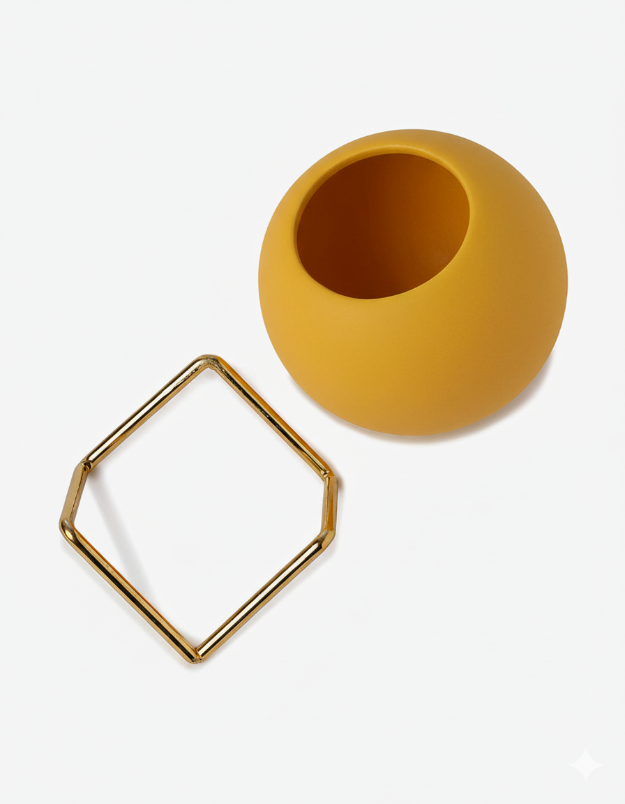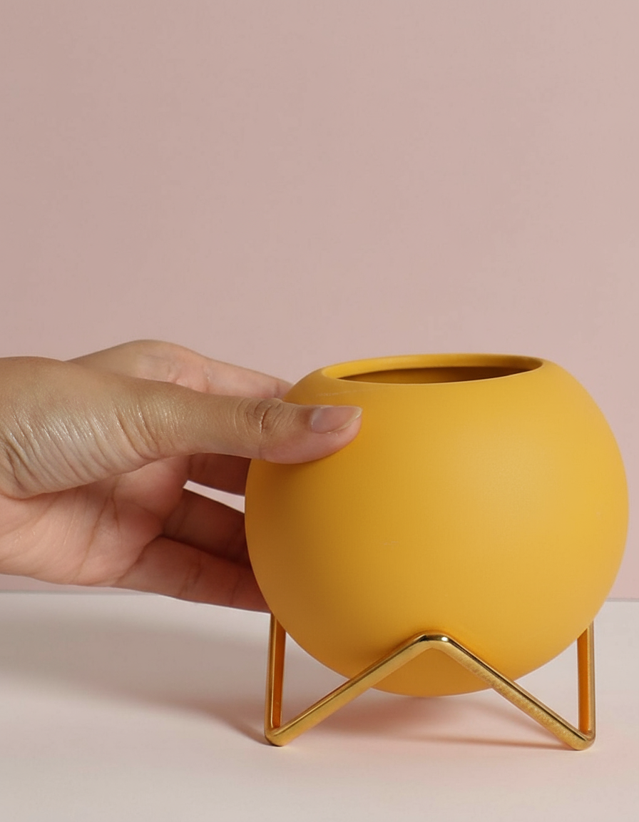 • Design: Smooth, rounded form in a vibrant yellow, accented by a geometric gold metal stand for style and stability