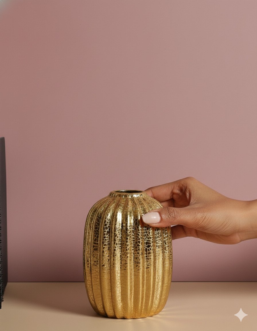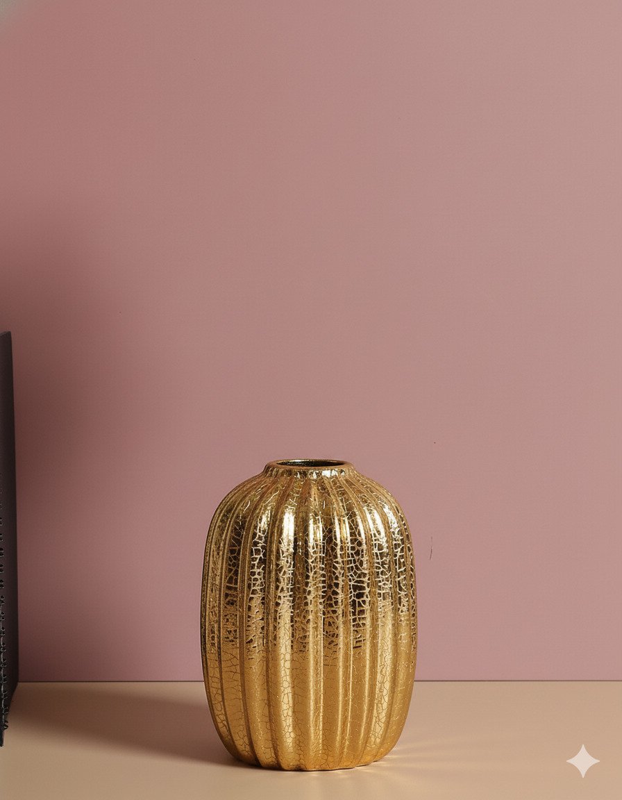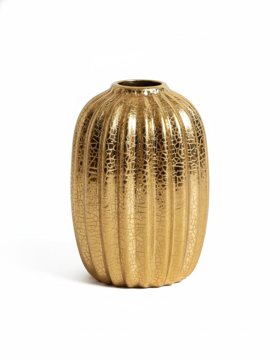 Rich and radiant, this Electroplated Gold Crack Vase in small size features a tall, rounded silhouette with softly fluted vertical ridges. The electroplated gold finish is enhanced by a delicate crackle effect, giving the surface a vintage, timeworn elegance while still feeling luxurious and modern.