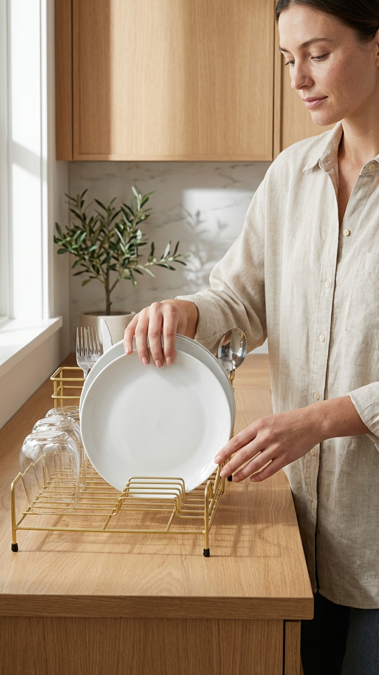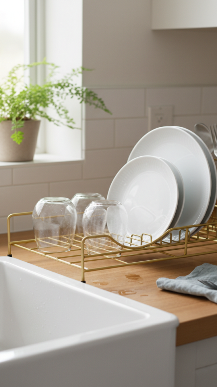 Ideal for modern kitchens, this drying rack helps maintain an organized countertop while enhancing the overall aesthetic with its sleek gold finish.