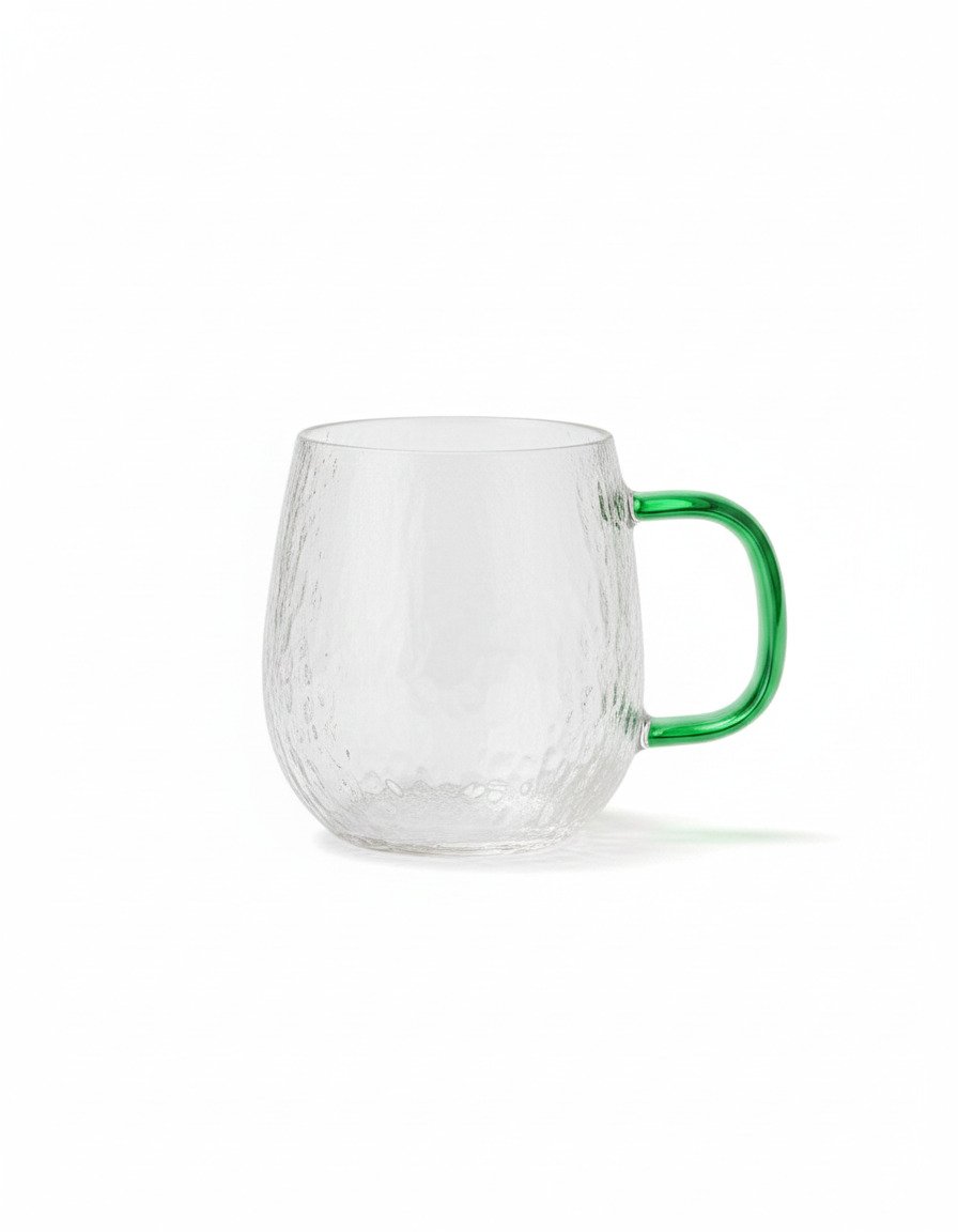 Design: Rounded, wide-body mug silhouette with an irregularly textured, hammered finish across the glass. Features a sturdy, clear green glass handle for striking contrast against the amber or clear contents.