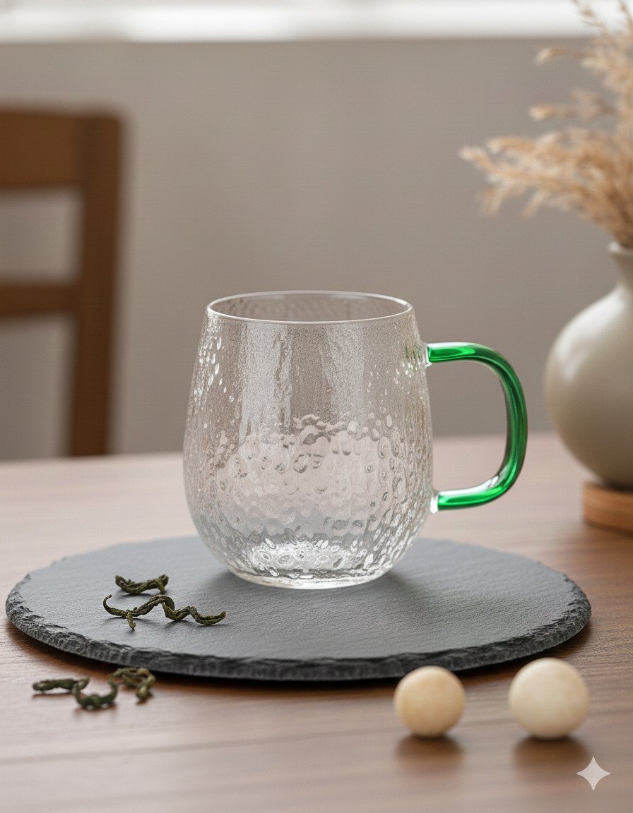 Material: Crafted from high-quality, durable, heat-resistant glass with an artfully textured surface. The handle is made from colored green glass.