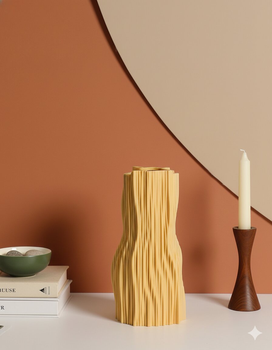 Add a bold statement to your decor with this Large Yellow Vertical Patterned Irregular-Shaped Vase. Featuring a unique, organically contoured silhouette and yellow color finish, its surface is adorned with refined vertical ribbing that enhances the sculptural effect and provides a dramatic sense of movement.