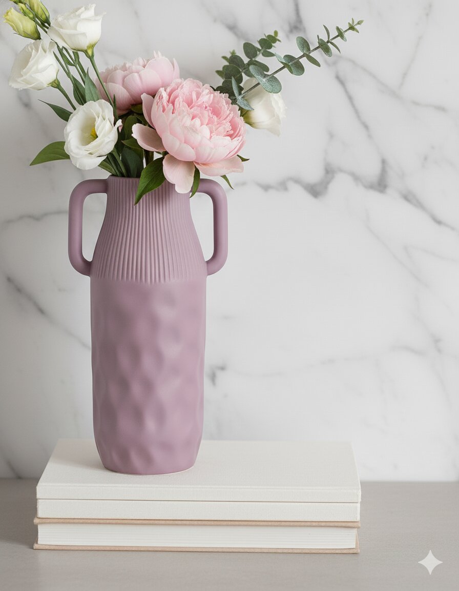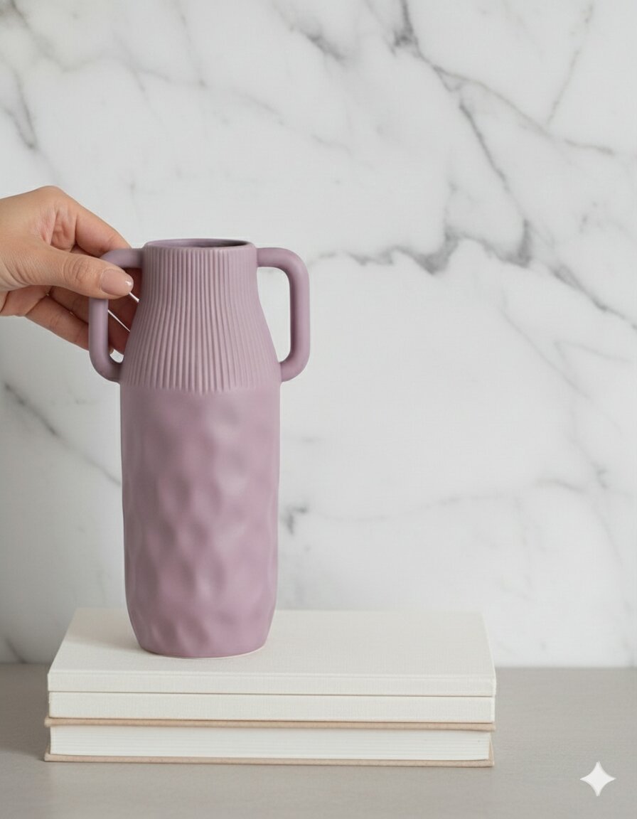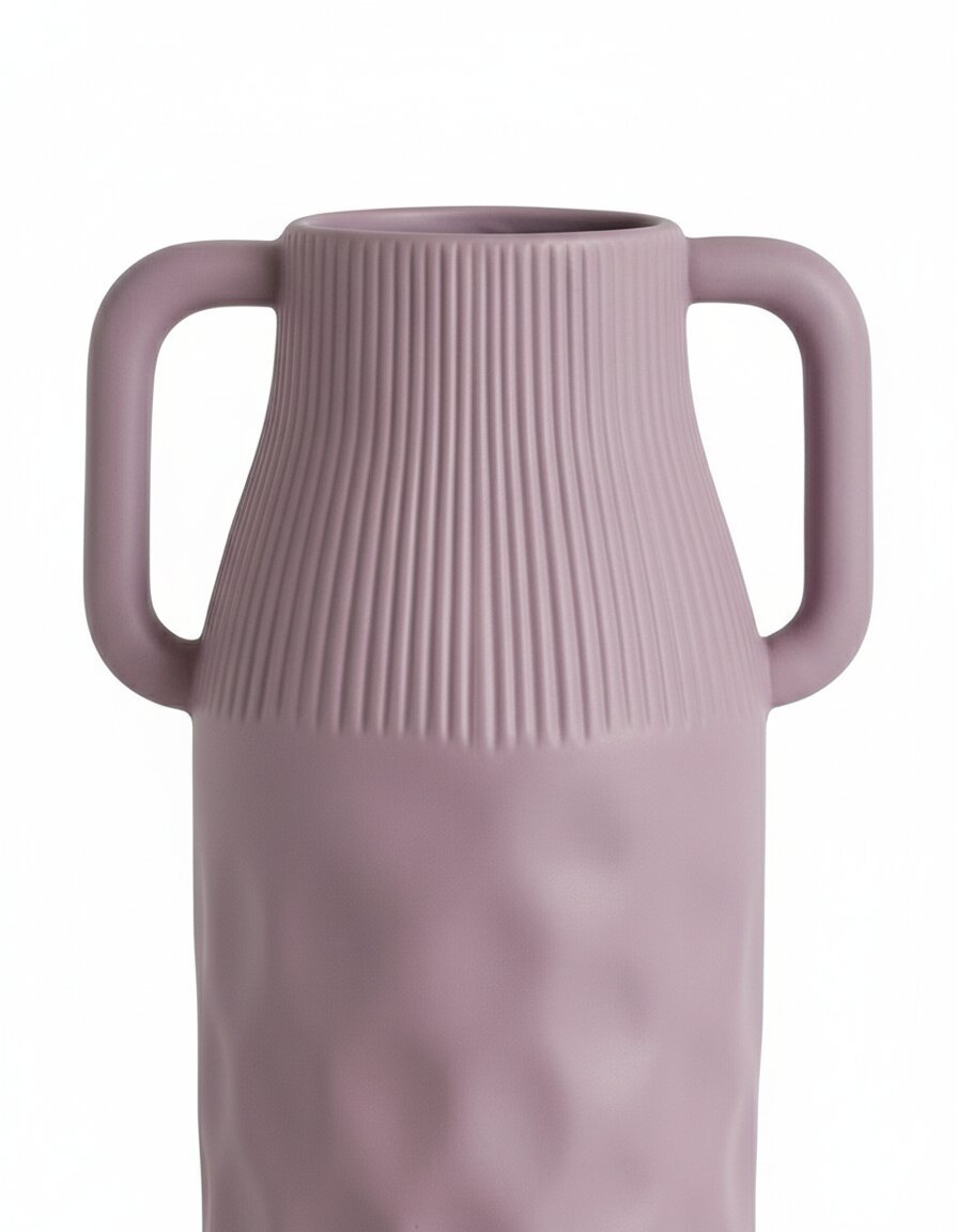 Introduce artistic flair to your space with this Matte Purple Double-Eared Vase, featuring a minimalist cylindrical shape, elegant side handles, and a soft lavender matte finish. The vase boasts a ribbed upper section and subtle hammered texture on the base for a blend of modern and classic style.