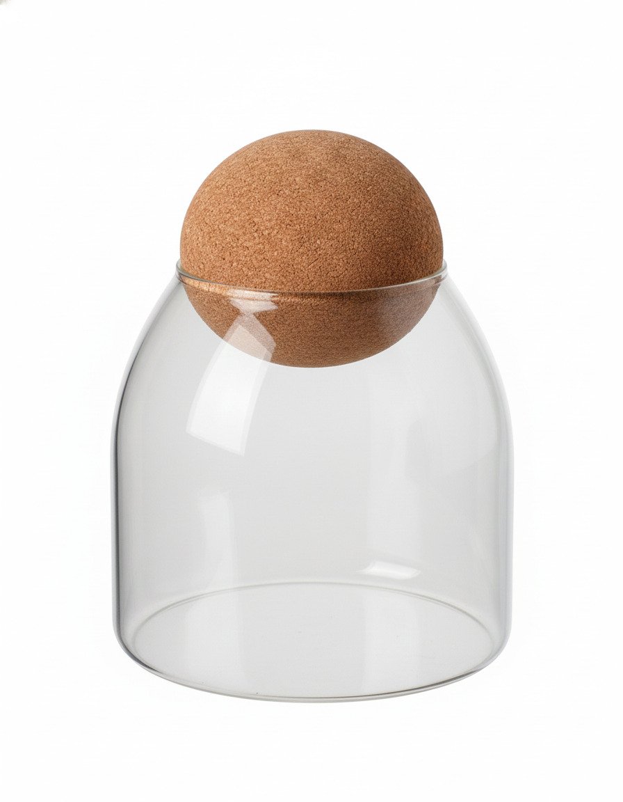 Design: Wide, stable glass body with a rounded base and a short, tapered neck designed to accommodate the distinctive spherical cork stopper. The design ensures an airtight seal for optimal freshness. Capacity is ideal for small portions or daily use items at 500ml (approx. 17 oz).