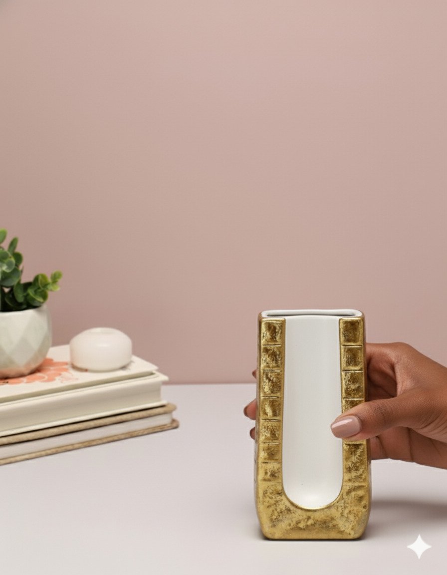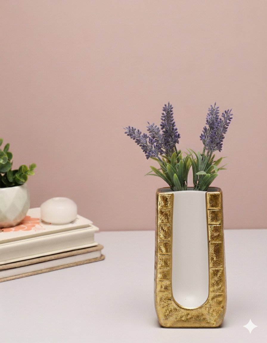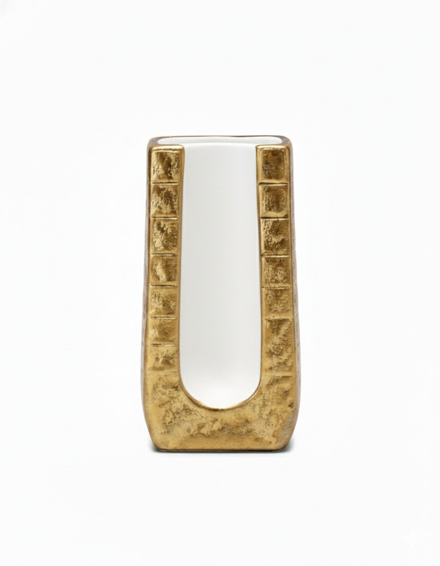 Striking and architectural, this Small Golden Square White Background Vase combines a small, squared silhouette with a deep white inner channel. The front U-shaped recess reveals a smooth white core framed by richly textured electroplated gold, creating a bold contrast that feels both modern and luxurious.