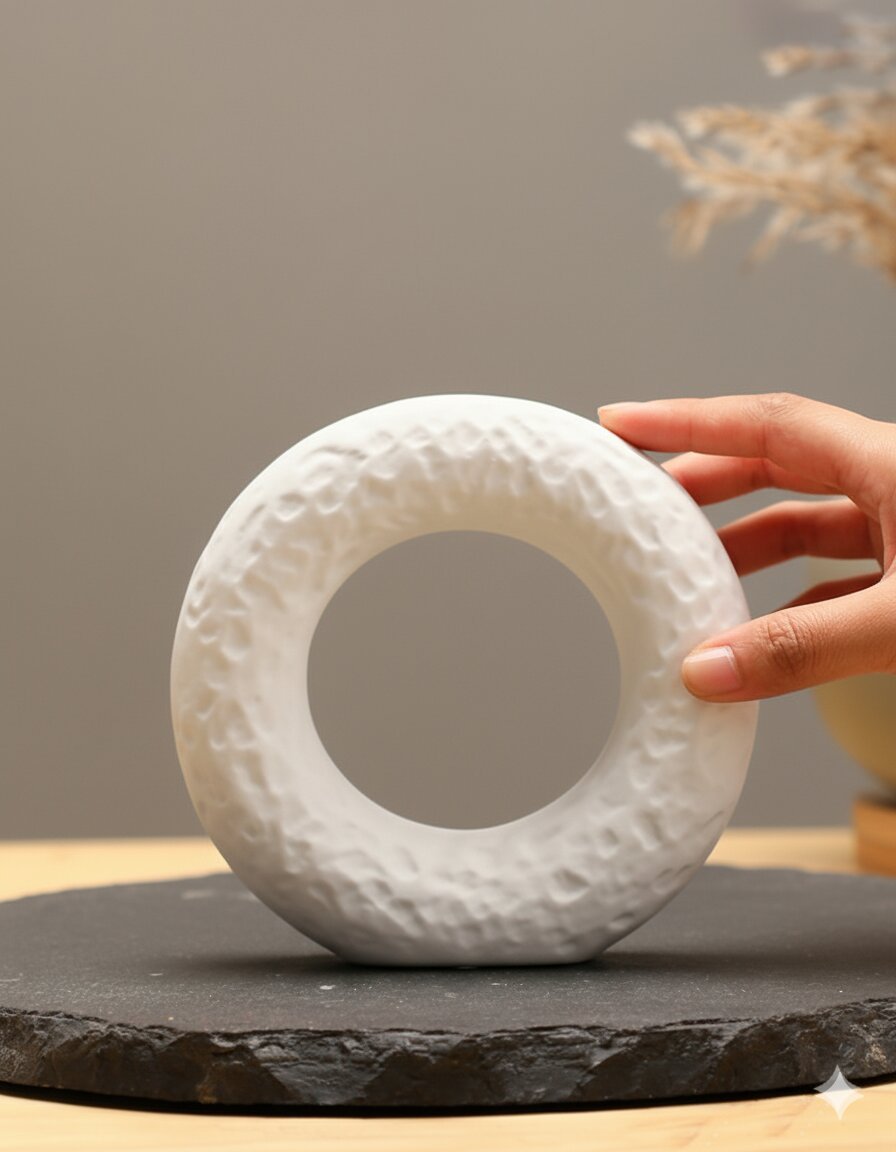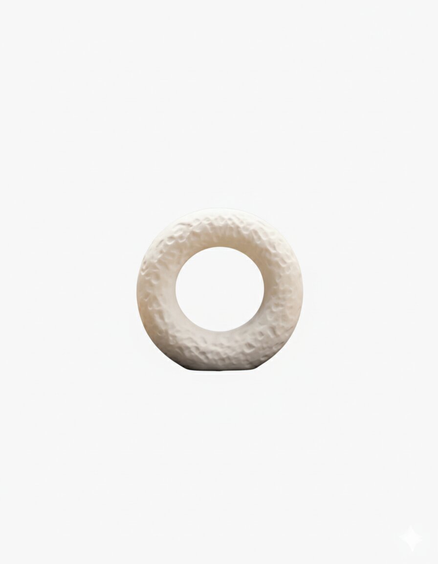 Design: Perfect circular form with an open center and organic, hand-crafted surface texture in pure white