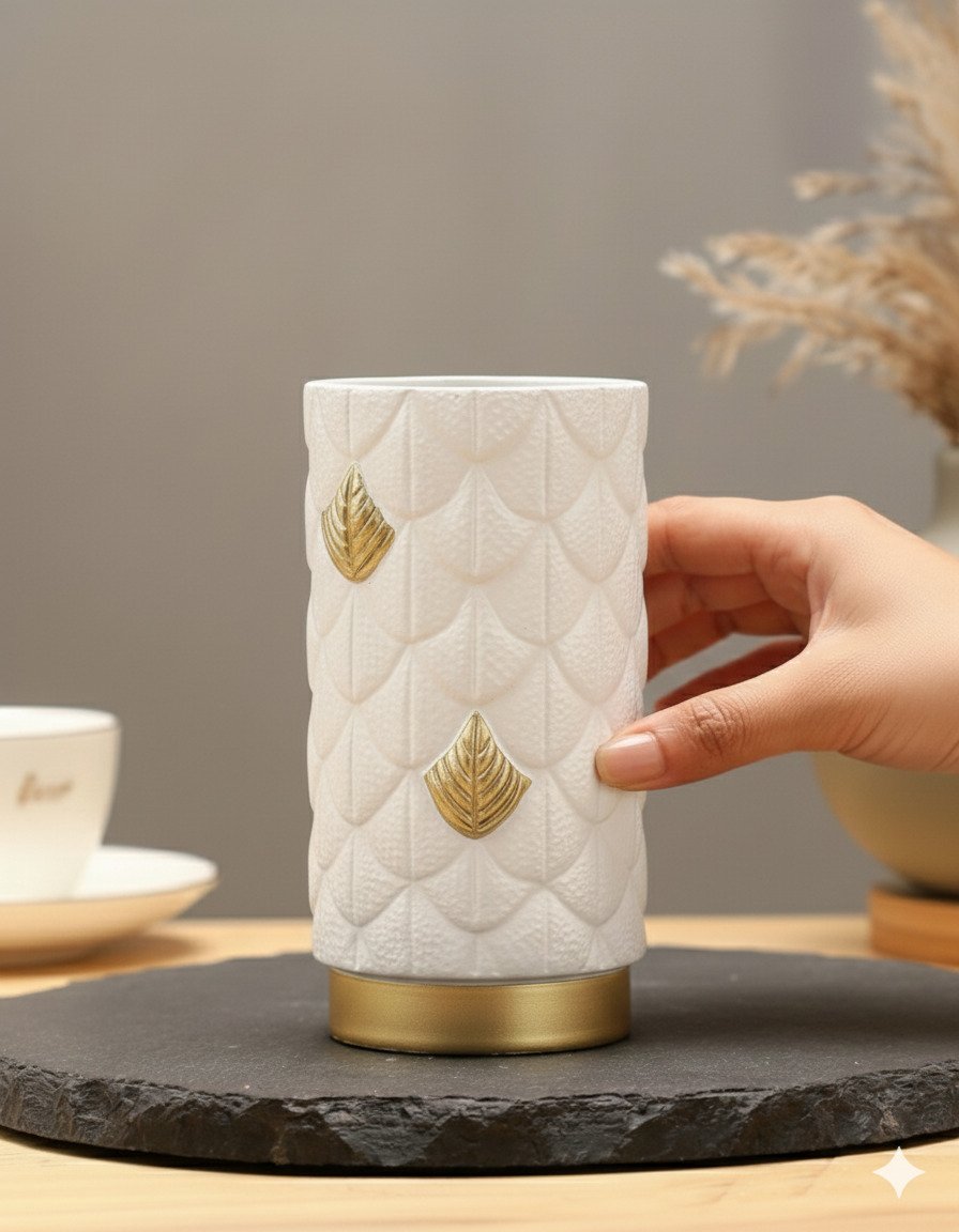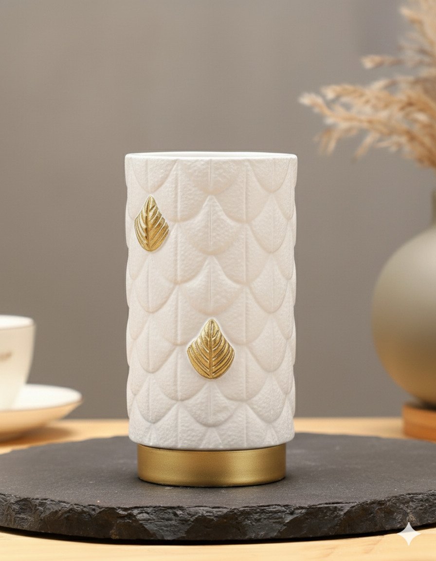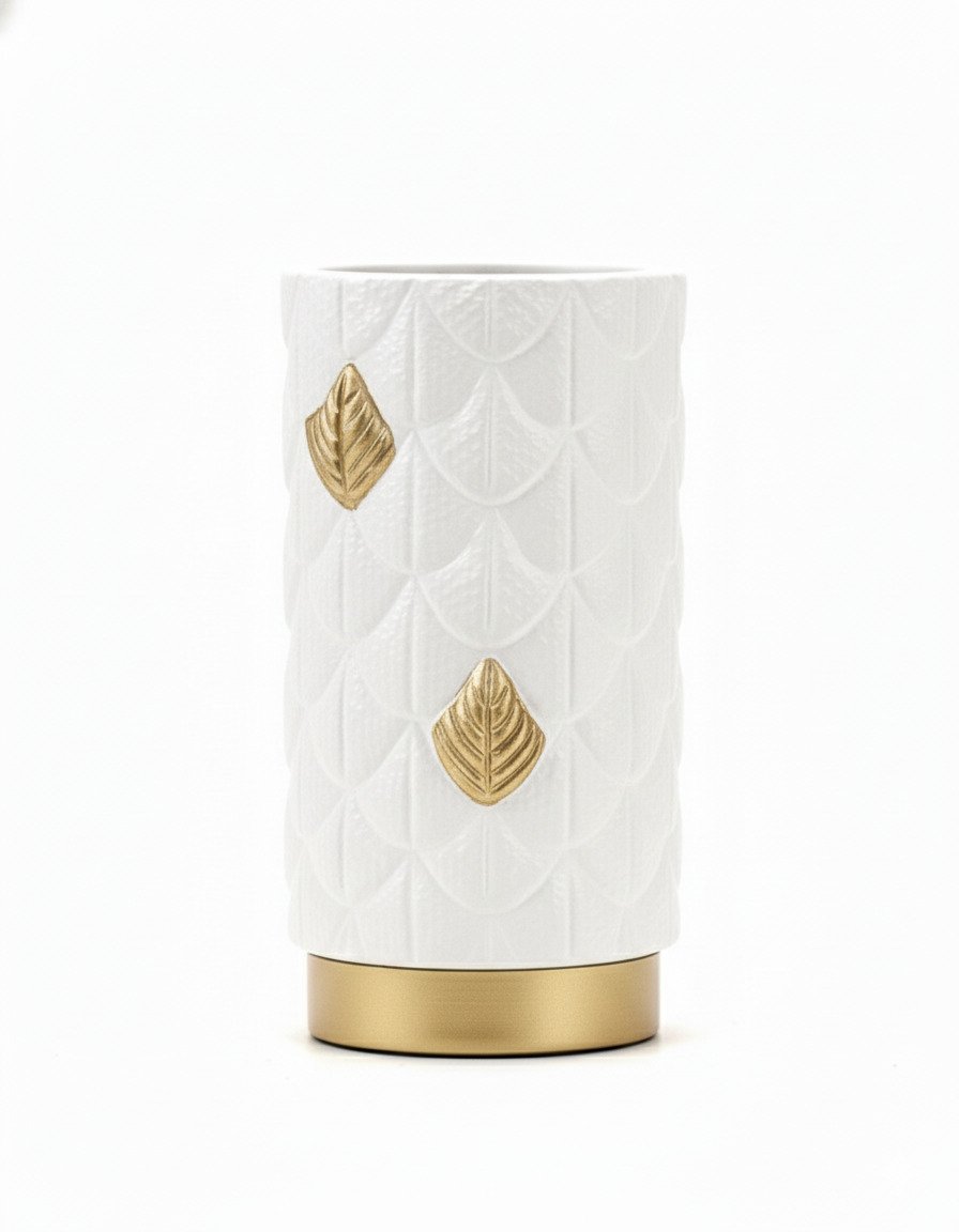 Refined and tactile, this Small White Vase features a cylindrical form wrapped in sculpted, scale-like leaf motifs. Select leaves are highlighted in a warm golden finish and paired with a brushed gold base, creating a luxurious contrast against the deep matte white surface.