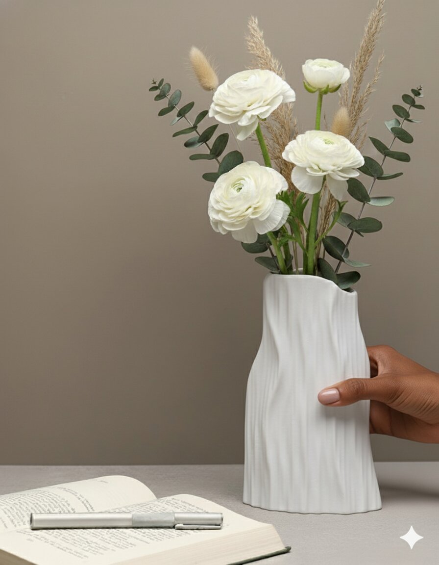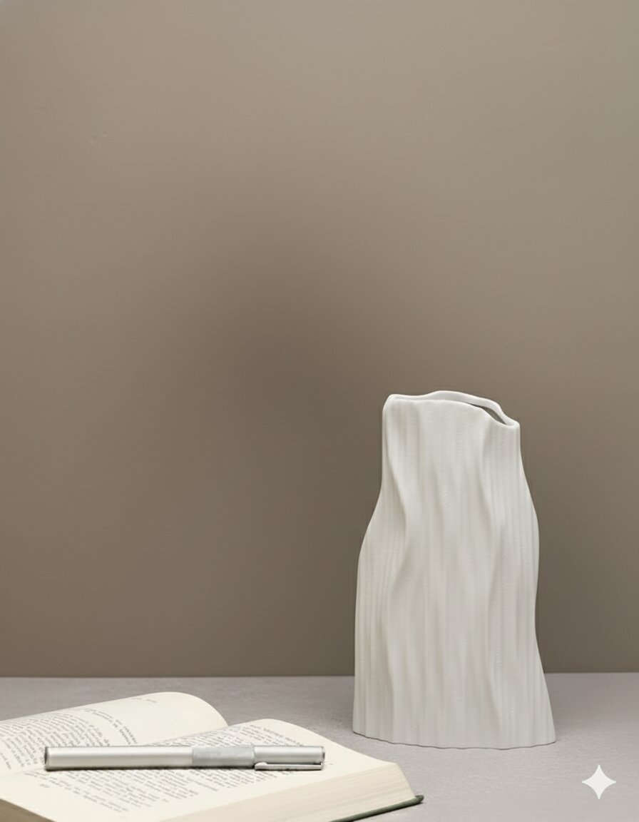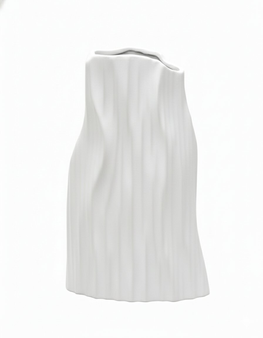 Add a touch of sculptural elegance to your space with this Small White Vertical Patterned Irregular-Shaped Vase. Its organically contoured silhouette features gently undulating edges and a soft matte white finish, while the vertical ribbed pattern provides modern texture and a sense of flowing movement.