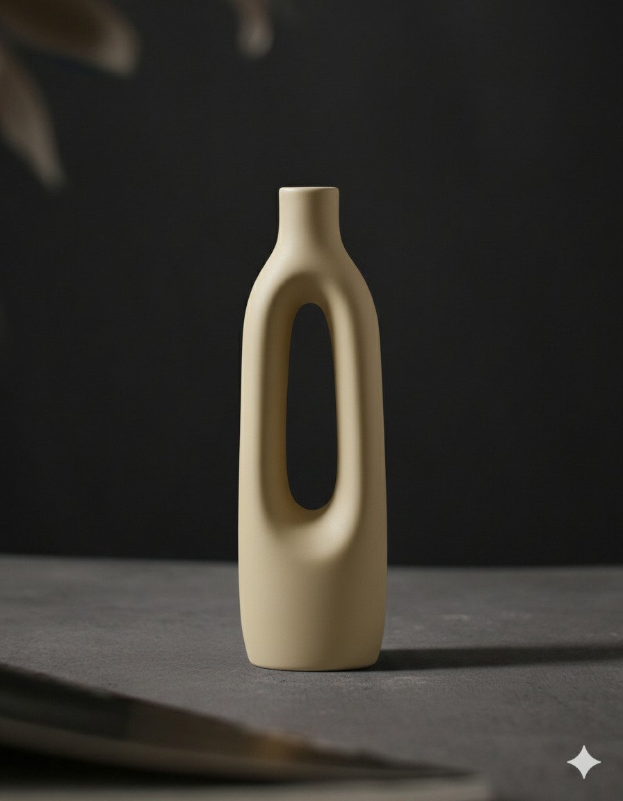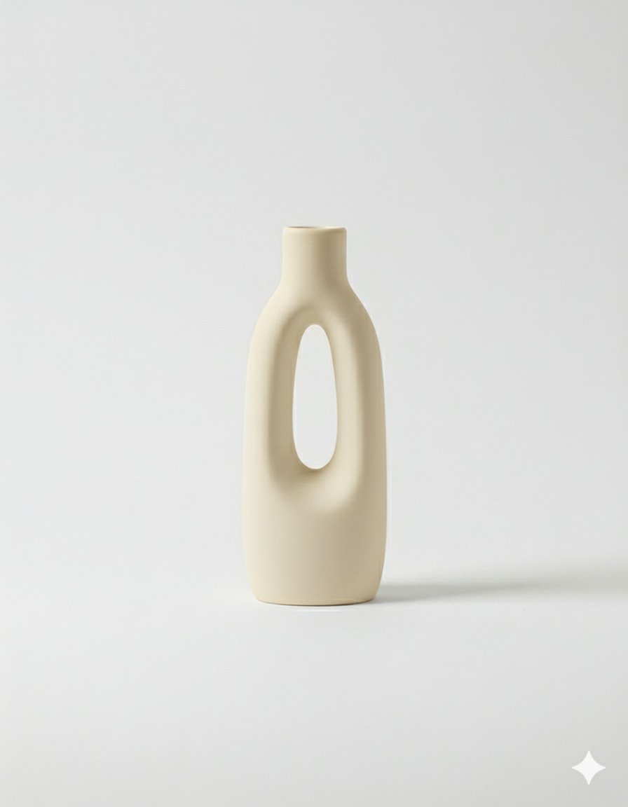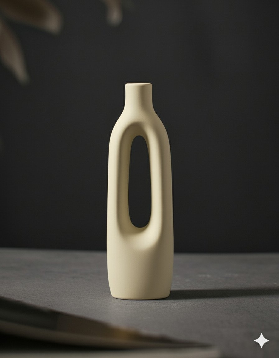 Understated yet striking, this Small Yellowish-White Tall Sculptural Vase features a compact, elongated form with a distinctive open center. The smooth matte yellowish-white finish and softly curved edges create a minimalist piece that feels both modern and serene.