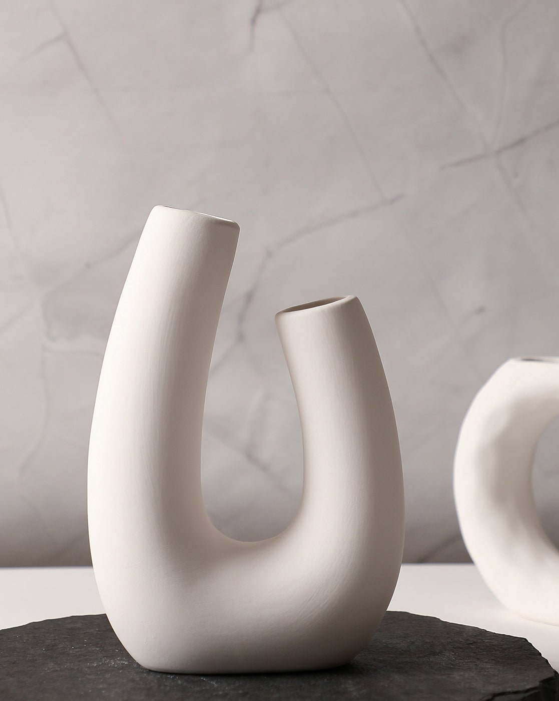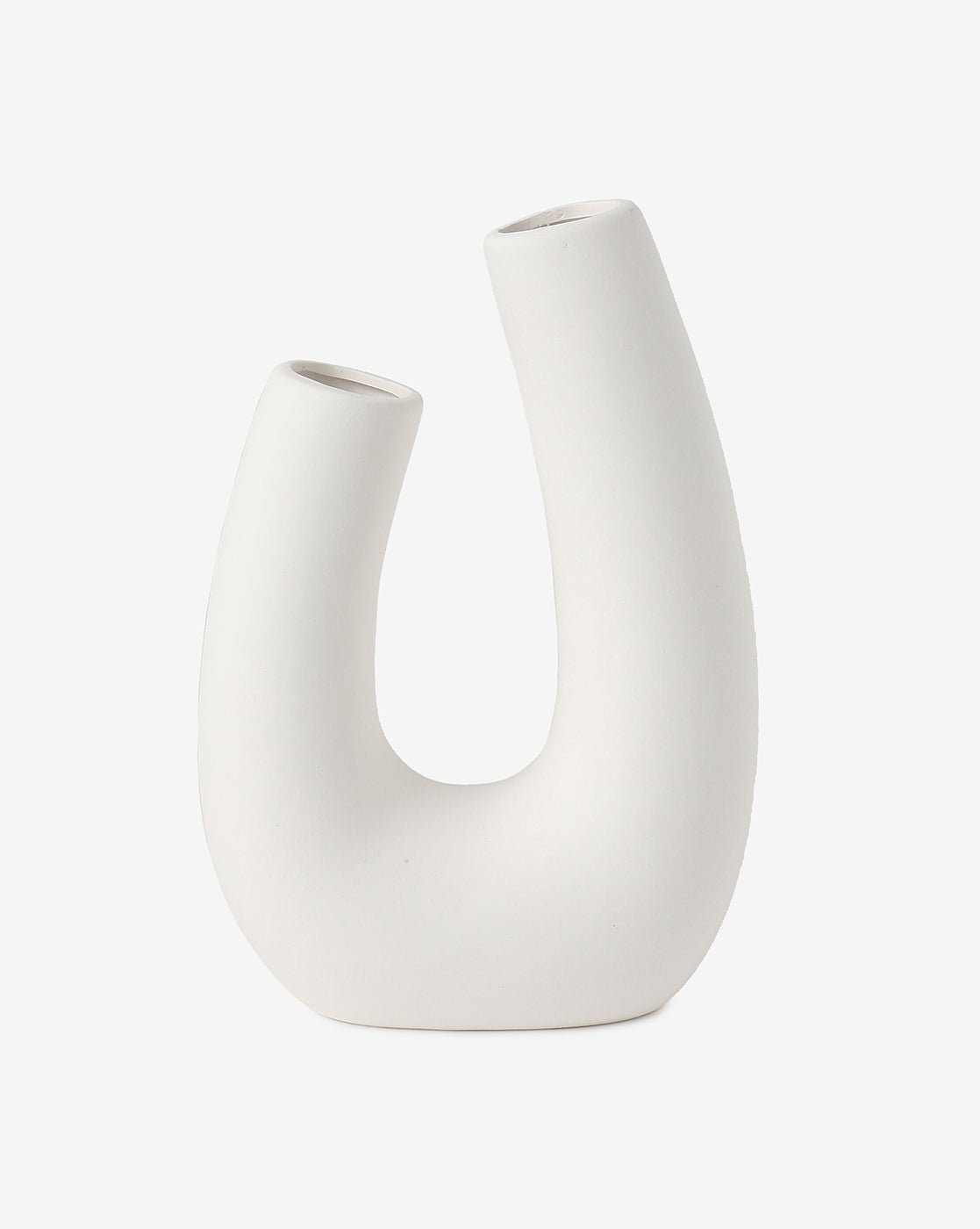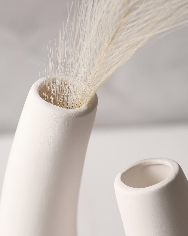 Design: Unique abstract shape with two angled openings, crafted in smooth matte white for a striking visual accent