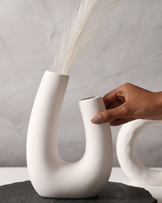 Introduce modern elegance to your décor with the White Abstract Ceramic Vase, featuring artistic fluid lines and a distinctive hollow silhouette. Its minimalist form brings a sculptural touch, perfect as a statement piece on shelves, mantels, or contemporary tablescapes.