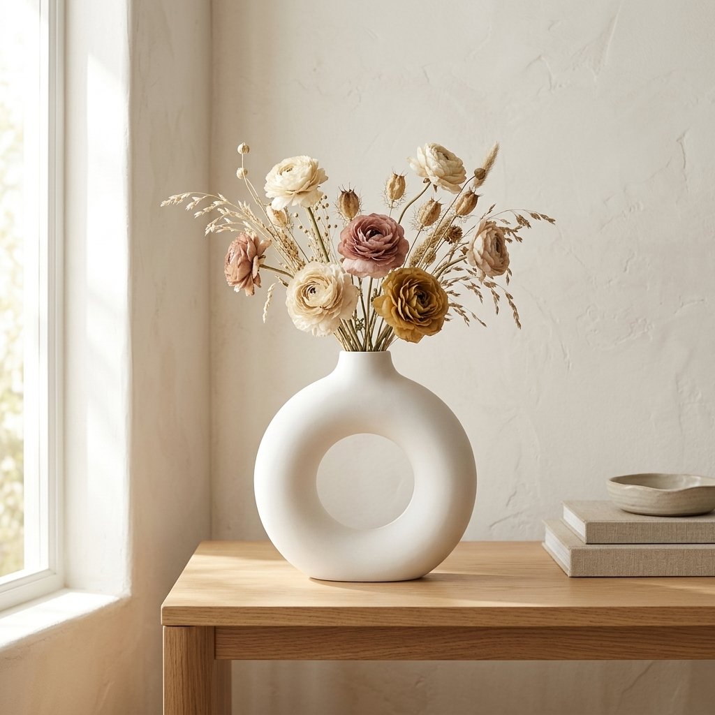 Add a contemporary artistic touch to your space with the VAS011 – White Sculptural Donut Ceramic Vase, designed to stand out with its unique hollow-centered silhouette. Inspired by modern sculptural trends, this donut-shaped vase serves as both a decorative art piece and a functional vase.